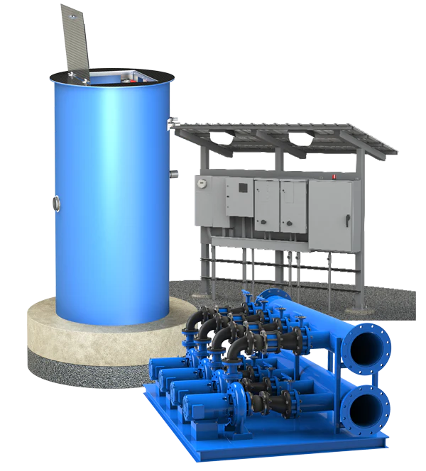 Automated Flow Systems (AFS) Packaged Lift Stations include a complete fiberglass reinforced polyester (FRP) wet well and valve vault assembly (as applicable) to provide a functioning lift station with minimal installation time and cost. The wet well assembly includes pump slide rails, discharge piping, and other hardware such as floats, transducers, and electrical junction boxes installed. The valve vault assembly includes discharge manifold, valves, ladder, and any other accessories. The pumps and controls are shipped separately but prepped for installation with slide rail couplings, lifting cables, and electrical cable strain reliefs installed to expedite field installation.
