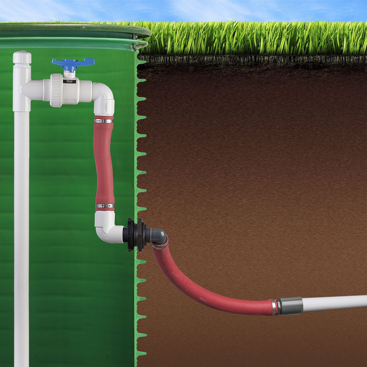 External flex assemblies are used to provide a flexible connection between the pump chamber and the discharge pipe. High and low pressure models are available to handle discharge pressures up to 200 PSI. The flexible hose provides easy connection to transport pipe regardless of difficult alignments and also takes up movement during settling to prevent breakage of rigid pipes. External flex assemblies are built using all corrosion resistant materials and durable SCH80 PVC fittings.