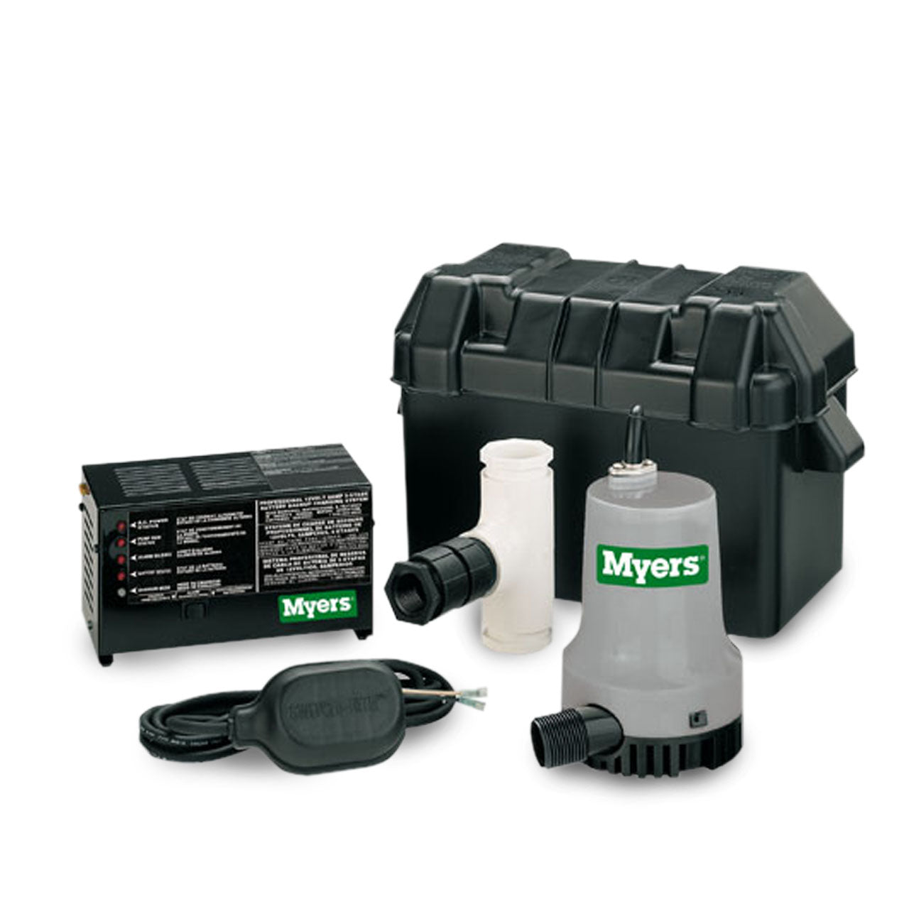 The Myers ® MBSP-Plus battery operated back-up sump pump system provides high-capacity protection in case of primary residential sump pump failure or power outage. Fully automatic, computerized monitoring, control & alarm system.